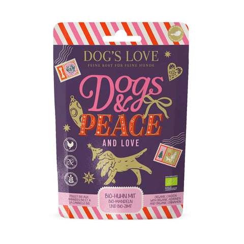 DOG'S LOVE hält’s mit seinen limitierten Winter-Chips wie immer simpel, hochwertig und straight: Bio-Huhn, Bio-Mandeln, Bio-Zimt. Kurze Zutatenliste, langer Genuss! Und nicht nur der Inhalt ist geschmackvoll – auch die cute designte Tüte ist schon beim Öffnen ein Augenschmaus.
