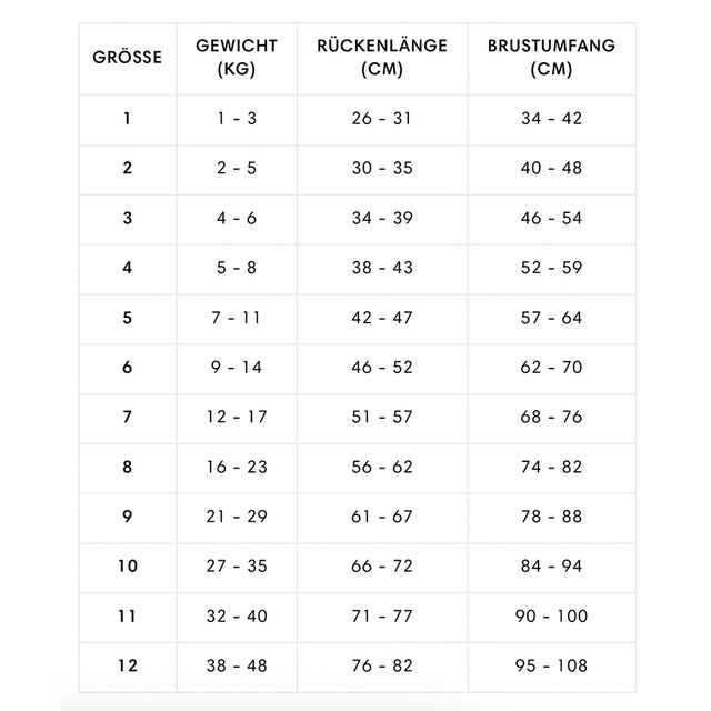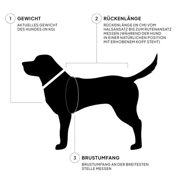 Alle Größen in cm * HUNDEGEWICHT in kg. ** RÜCKENLÄNGE messen vom unteren Halsbandrand bis Rutenansatz (bei erhobenem Kopf des Hundes und locker getragenem Halsband). *** BRUSTUMFANG an der breitesten Stelle messen.