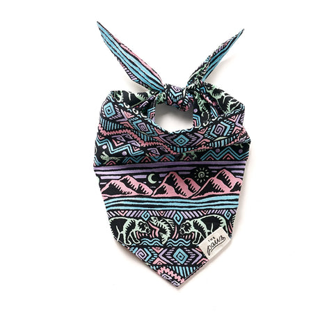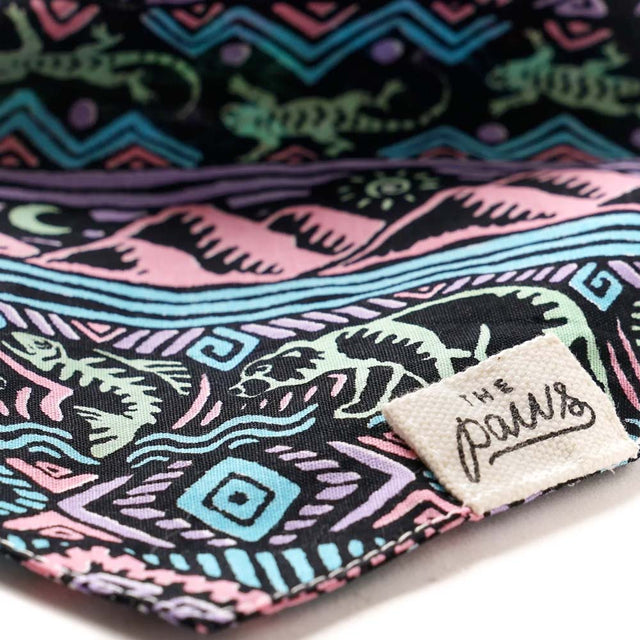 Das Bandana Wild Dog von The Paws hält, was der Name verspricht. Wilder Print mit Gebirge, Grizzlys und springenden Lachsen und ein wilder Farbmix aus Rosa, Hellblau und Schwarz sorgen für Abenteuer-Vibes. Perfekt für alle Hunde, die es draußen gern bunt treiben!