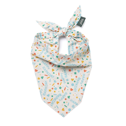 Knallbuntes Konfetti auf cremeweißer Baumwolle, dazu allover der fröhlich verstreute Schriftzug „Happy Barkday“ in Babyblau: Sparkle Pawty ist das Bandana für Fellnasen, die ihren großen Tag mit Style feiern. 100% Baumwolle, handmade in Bali, easy umzubinden und bereit für jede Geburtstags-Sause!