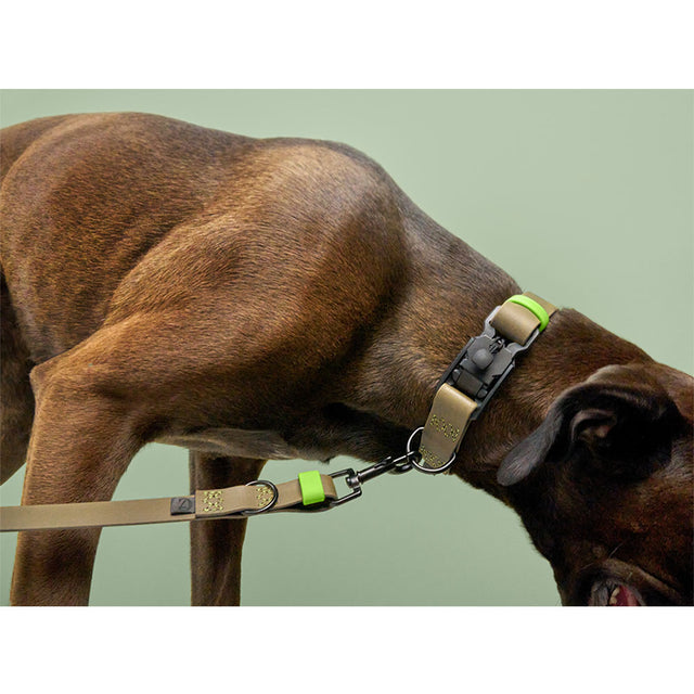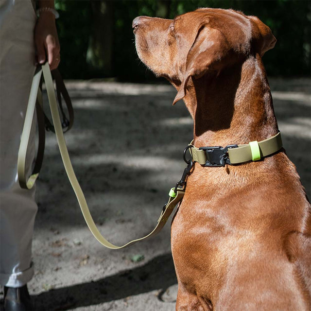 Olivefarbene BioThane-Material trifft auf knalliges Neon – ein Eyecatcher mit Understatement. Die mattschwarzen Karabiner setzen stylische Kontraste, während der Stoff easy jedem Wetter trotzt. Regen, Schlamm, Bachlauf? Einmal abspritzen und fertig.