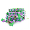 Der Look? Premium! Tragekomfort und Langlebigkeit? Einfach nur WAU. Das lilafarbene Außenleder ist extra robust und langlebig, während die grüne Innenseite sich butterweich an den Hals deines Hundes schmiegt. Extra hippes Happy-Feeling gibt's dank grüner Lederquaste und lila Smiley-Anhänger; der gestanzte Messinganhänger versprüht zusätzliche Hippie-Vibes. Für Hunde, die's gern bunt treiben!