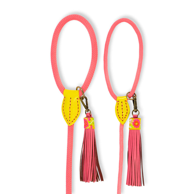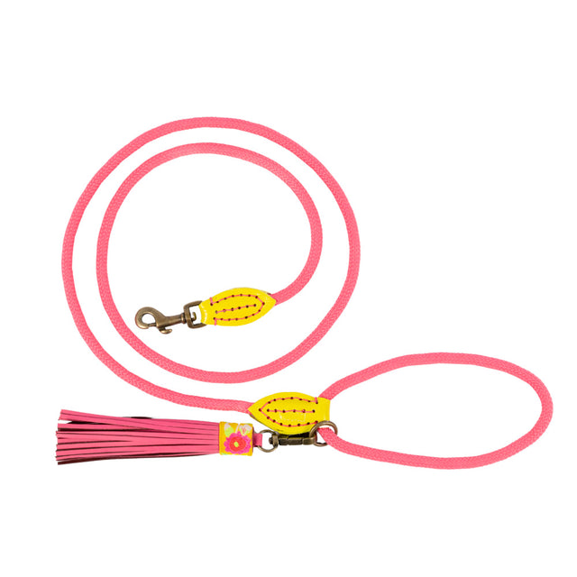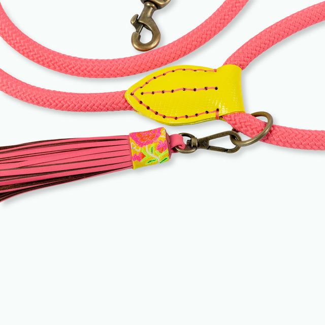 Die floraler Bordüre aus robustem Segeltuch wirkt an der pinken Lederquaste wie ein Statement für Lebensfreude, die gelben Lederdetails setzen zusätzlich leuchtende Akzente. In der Hand fühlt sich die Leine griffig und sicher an – kein Schnickschnack, sondern echtes Komfortgefühl. Der massive Messingkarabiner ist leicht zu bedienen, sitzt sicher und passt perfekt zu Halsband oder Geschirr.