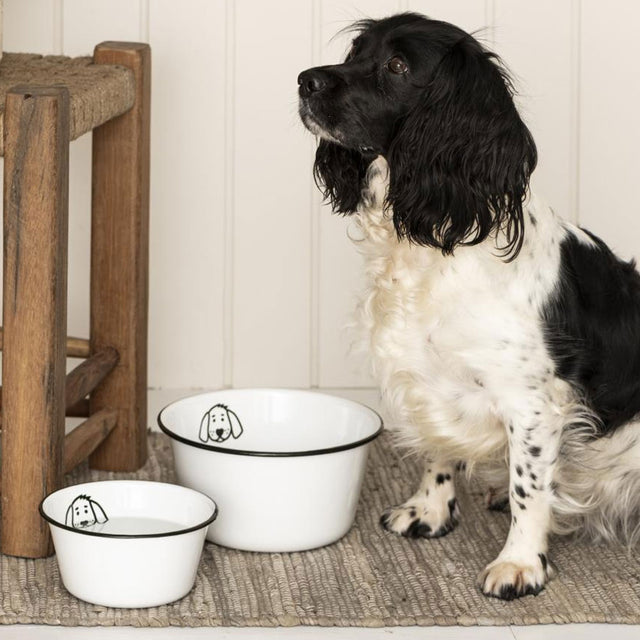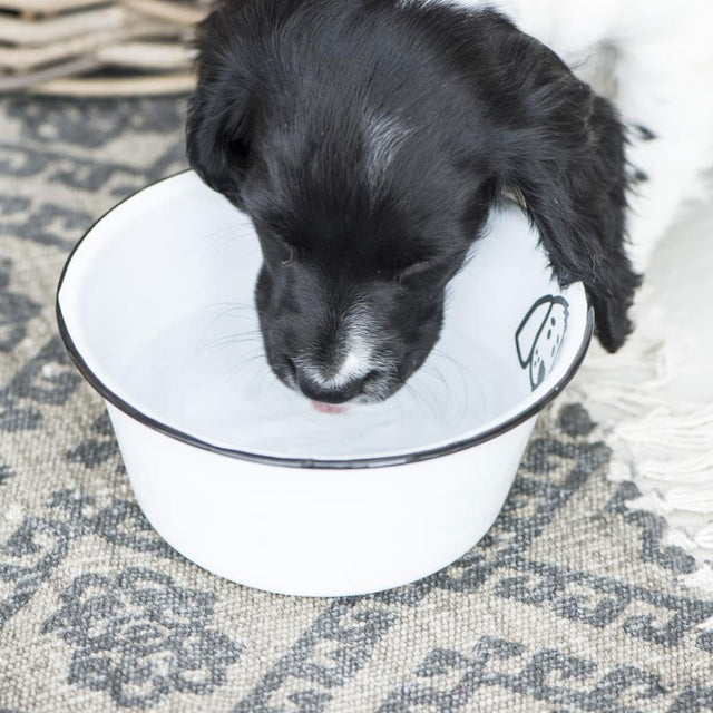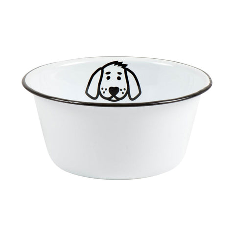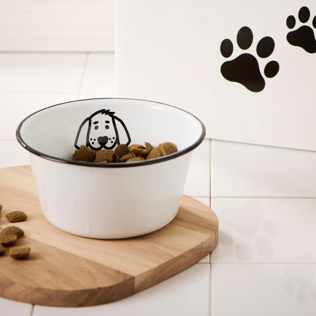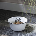 Der schwarze Rand, die cleane weiße Oberfläche und der kleine Hundekopf innen – jedes Detail schreit nach Retro-Flair. Und weil Emaille nie ganz perfekt ist, wird jeder Napf zum charmanten Einzelstück. Leicht zu reinigen, mega robust und in zwei Größen erhältlich – für zu Hause, für unterwegs, für überall.