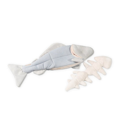 Der ca. 35 Zentimeter große Flausch-Fisch sieht aus wie ein Kuscheltier, hat deinen Doggo aber mit allen Sinnen an der Angel: Zwei weich gepolsterte Gräten mit eingebautem Quietscher verstecken sich im Fischkörper und wollen rausgeknibbelt werden.
