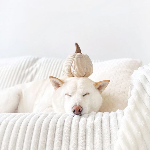 Ein Genuss wie frisch vom Feld – weich, plüschig, prall, mit angenehmer Cord-Struktur. Doch statt Kernen birgt Boo kleine Überraschungen: Sechs seitliche Schlitze, in denen du Leckerlis verstecken kannst. Für Bonus-Fun sorgt drei Quietscher im Inneren!