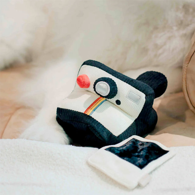 Das Design ist angelehnt an die kultige Sofortbildkamera – nur dass hier nicht geblitzt, sondern geflitzt und geschnüffelt wird. In deiner Hand liegt sie leicht, griffig, weich – ein Mix aus wertigen Materialien, detailverliebt vernäht. Beim Schütteln knistert’s spannend, das „Polaroid“ raschelt und lädt direkt zum Zuppeln ein.