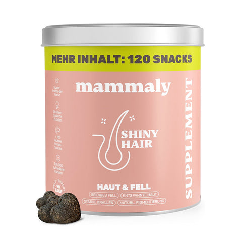 Hundefell ist mehr als Optik – es ist ein Spiegel des Wohlbefindens. Die mammaly Shiny Hair Fellpflege-Snacks bieten schmackhaften Support, wenn Haut und Haar aus dem Gleichgewicht geraten. Ob stumpfes Fell, schuppige Stellen oder brüchige Krallen: Die Rezeptur ist darauf ausgelegt, anspruchsvolle Phasen ernährungsphysiologisch zu begleiten.