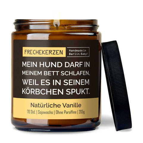 Die Sojakerzen im Braunglas (205g) sind liebevoll handgegossen, frei von Plastik, Paraffinen & Co. Der Spruch „Mein Hund darf in meinem Bett schlafen, weil es in seinem Körbchen spukt“ trifft Dog Lover voll ins Humorzentrum. Der Duft? Vanilla-Vibes mit feinen Karamell- und Kondensmilchnuancen. Die Mischung sorgt für ein warmes, hyggeliges Gefühl, ohne die chemische Kopfschmerz-Wolke vieler klassischer Kerzen.
