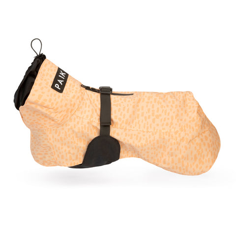 Der PAIKKA Hunderegenmantel 2.0 Pfirsich kombiniert Hightech mit modernem Style. Das wind- und wasserdichte Gewebe (Wassersäule 10.000 mm) mit verschweißten Hauptnähten hält trocken, egal ob Niesel- oder Platzregen. Ein leichtes Netzfutter sorgt für Komfort, ohne zu beschweren. Dazu ist alles individuell verstellbar: Halsausschnitt, Taille, Rückenlänge, Beingurte ... So sitzt der Mantel immer wie maßgeschneidert.