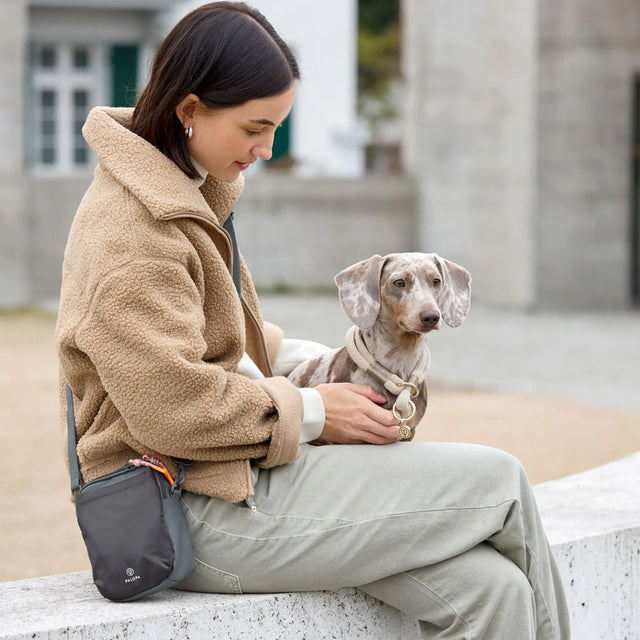 Der Leckerlibeutel Greta in Dunkelgrau von PALOPA ist urban, edel und funktional – und setzt mit seinen orangefarbenen Zippern ein selbstbewusstes Design-Statement. Die durchdachte Material- und Farbkomposition verbindet schlichte Eleganz mit Techwear-Vibes. Ob Gassi in der City oder Hundetraining im Park: Greta ist dein smarter Begleiter mit Stylefaktor – wetterfest, flexibel tragbar und bis ins Detail clever konzipiert.