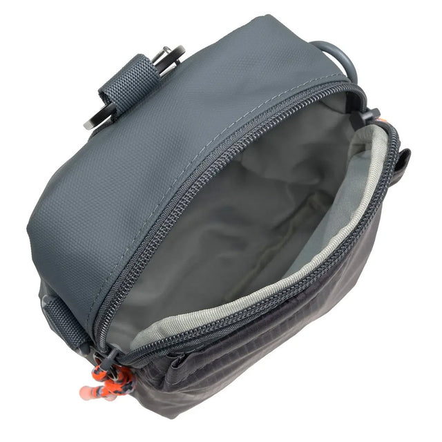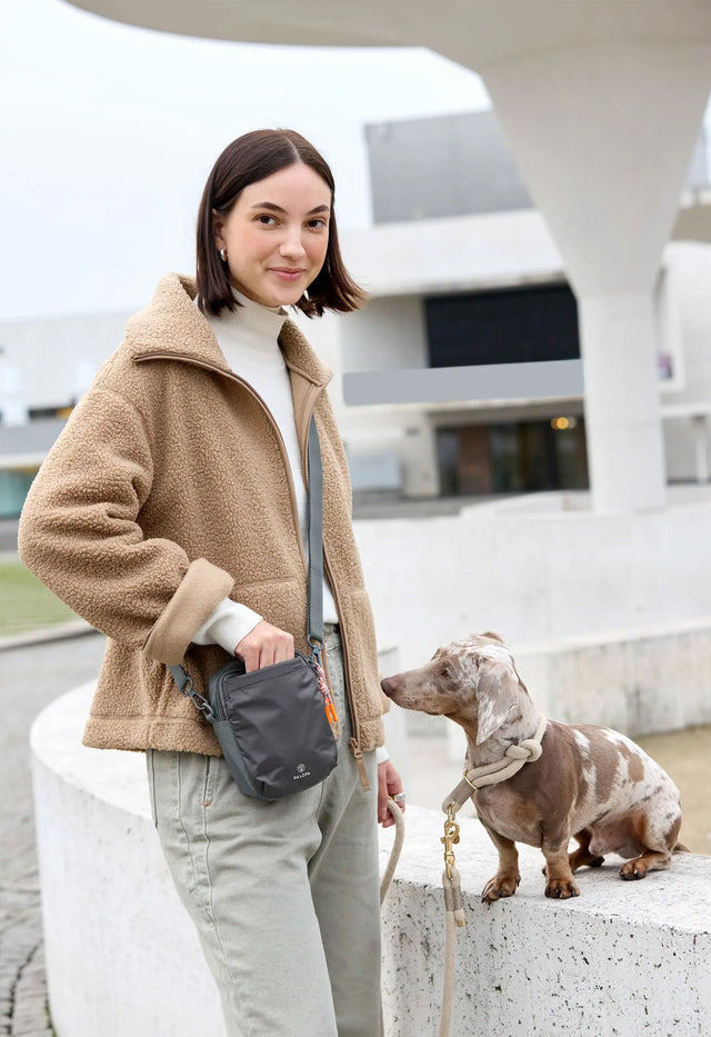 Die Leckerlitasche Greta in Dunkelgrau bringt alles mit, was du für deinen Alltag mit Hund brauchst – und noch mehr: Das elegante Grau harmoniert perfekt mit der dunklen Hardware, während die orangefarbenen Zipper ein cooler Eyecatcher sind.